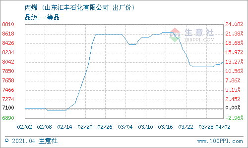 4月2日,山東匯豐石化有限公司丙烯最新報價上調,漲50元/噸至8050元/噸。