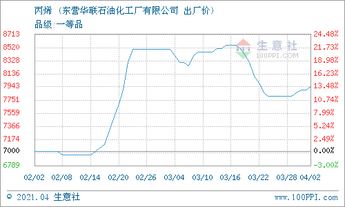4月2日,東營華聯石油化工廠有限公司丙烯最新報價上調,漲50元/噸至7953元/噸。