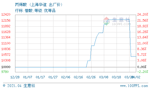 4月1日,上海華誼丙烯酸最新報價(華東送到)在10500元/噸,較上一交易日相比持平,實際成交價以協商為主。