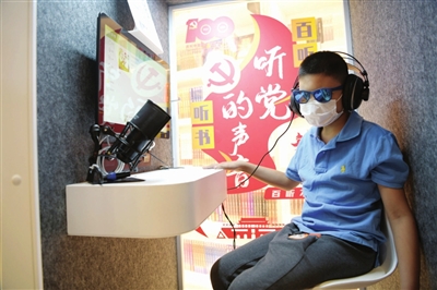 視障兒童在融合閱讀體驗區體驗有聲閱讀。