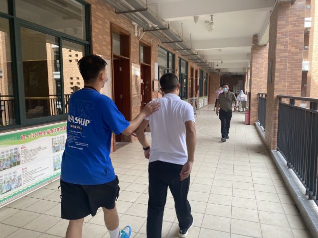 上課時,師生全程佩戴口罩。有學生身體不適,經(jīng)確認該生返校前有與密接者接觸史,任課教師立即停止講課,向年級行政報告,年級行政安排相關醫(yī)務人員帶領不適學生走出教室,到醫(yī)務室測量體溫后,送往隔離室。