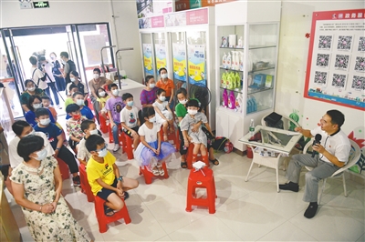 本報訊 8月23日上午,第十三屆中山書展進小區第一場活動在東區街道遠洋城小區社區服務站舉行。當天服務站里坐滿了小朋友和家長,大熒屏前,中山市“四史”宣講團成員姚曉波正以“高舉偉大旗幟,奮進偉大征程”為主題,為現場人員開展主題宣講。