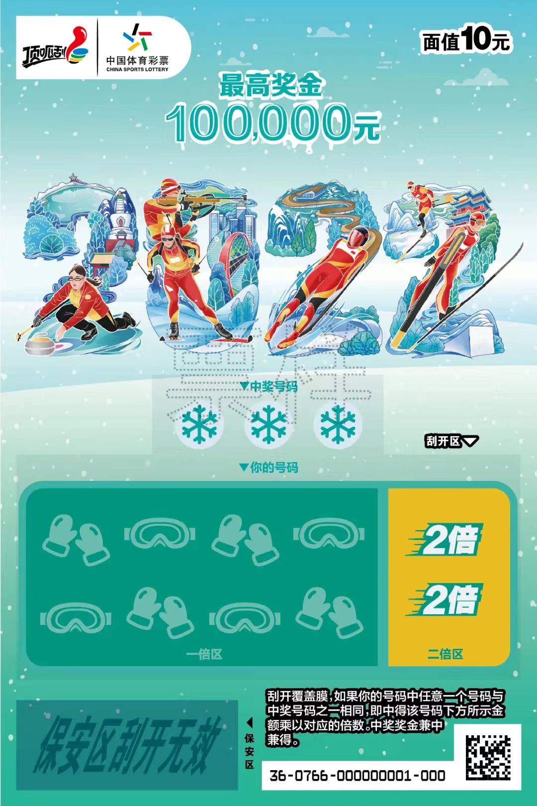 此前我們已經介紹過體彩虎年生肖票了,而2022北京冬奧會是中國體育的第一盛宴,“2022”主題票面通過數字2022展現出中國體育健兒在冰雪運動中英姿颯爽,也號召大家喜迎北京冬奧、為中國體育加油。“2022”面值10元,游戲玩法為數字匹配,共有10次中獎機會,最高獎金10萬元。
