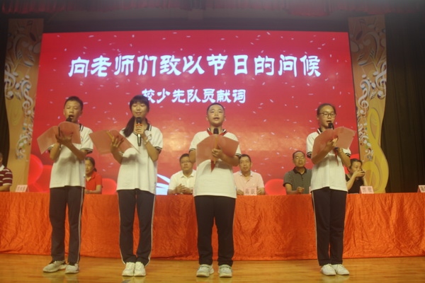 學(xué)生們?yōu)閼c祝教師節(jié)準(zhǔn)備了特殊的“禮物”。原彬豪、彭敏芝、歐梓瑤、肖學(xué)鈔四位同學(xué)為大家?guī)淼慕處煿?jié)少先隊員獻(xiàn)詞《我們終將成為你們的驕傲》,用抒情的詩句,表達(dá)了同學(xué)們對老師的尊敬和贊美。
