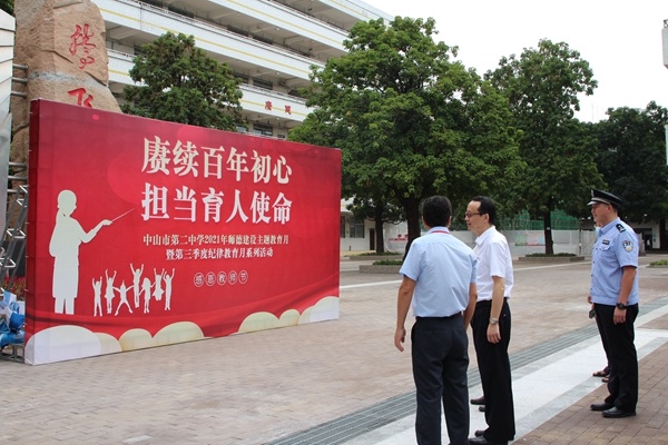 活動一:市領(lǐng)導(dǎo)蒞臨中山二中開展教師節(jié)慰問活動。9月10日上午,中山市副市長魯罡一行蒞臨中山二中開展教師節(jié)慰問活動。魯罡副市長走訪校園,視察校園基建工程,聽取中山二中黨委書記、校長吳祥明同志對學(xué)校歷史沿革、校史校情、二中近年發(fā)展情況的講解和匯報。黃圃鎮(zhèn)黨委書記梁泳輝,黃圃鎮(zhèn)黨委委員、市公安黃圃分局局長沈淼陪同慰問。