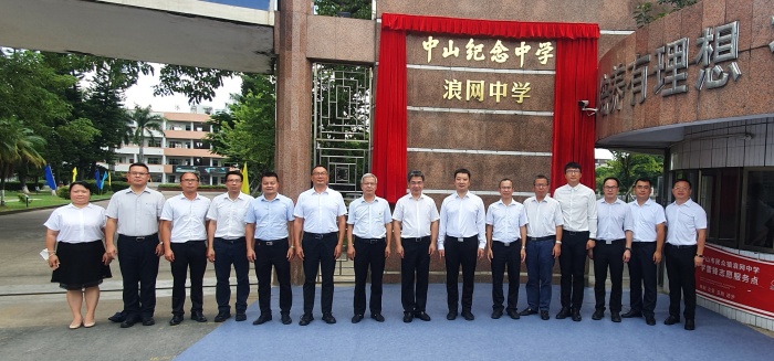 簽約儀式結束后,火炬開發區黨工委副書記黃宇健,火炬區黨工委委員、民眾街道黨工委副書記、辦事處主任黃聲群,市教育工委委員、教體局副局長黎國喜,中山紀念中學黨委書記、校長林加良前往浪網中學正門口與新任副校長楚東升舉行揭牌儀式并合影留念。