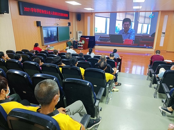 為了預防和及時處置食源性疾病等突發事件的發生,保護廣大師生的生命安全,做好中小學生營養配餐指導工作,改善學生營養,增強學生體質,9月9日下午,中山市舉辦2021學年學校食堂從業人員崗位衛生強化培訓班。古鎮鎮教育與體育事務中心衛生專干李維鋒、各中小學分管食堂的行政、食堂管理人員和從業人員和學生集體配送餐企業全體員工在曹二小學報告廳收看了培訓班直播視頻。
