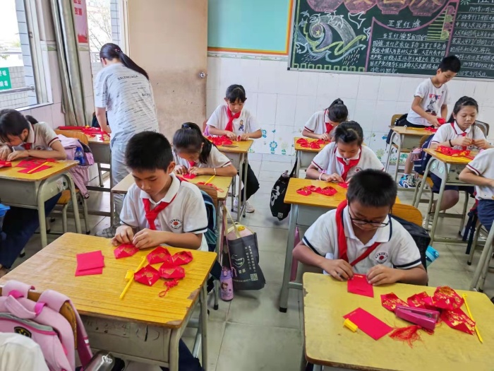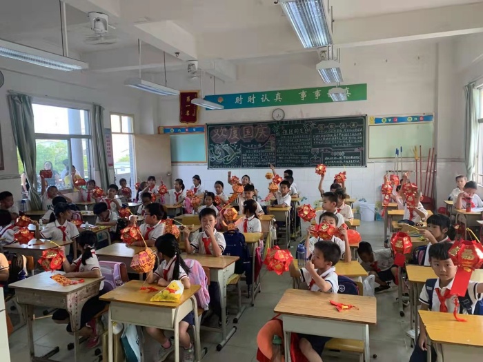 部分班級利用班會課開展手工制作燈籠活動,家委們先向同學們介紹了中秋節的來歷與習俗。接著,向同學們展示了中秋節燈籠作品,為所有同學分發了材料包,介紹了材料包里的工具。隨后,詳細地為同學們介紹燈籠的制作方法,同學們都很認真聽和觀察,聽完介紹后都迫不及待地開始動起手來。同學們按照制作步驟,先把燈籠框架組裝好,然后在紅包紙上涂上膠水,接下來在骨架上粘好紅包紙。在同學們的努力下,一個個精美的中秋節燈籠制作完成。