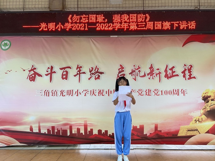 為紀(jì)念“九一八”事變90周年,進(jìn)一步弘揚(yáng)愛國主義精神,增強(qiáng)全體師生的國防觀念,9月18日上午,三角鎮(zhèn)光明小學(xué)組織全體師生開展紀(jì)念“九一八”主題教育活動。