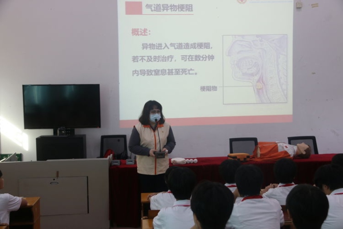 黎子丹老師通過將理論教學、案例講解和創設情景三者有機結合,認真、耐心、仔細地幫助師生了解到了氣道異物梗阻、燒燙傷、中暑、鼻出血等一系列突發狀況在日常生活中出現的誘因、表現的病狀及緊急處理方法和預防措施,其講解過程清晰明了,語言通俗生動,引發了師生們濃厚的興趣,適時的問答環節更是讓現場氣氛保持活躍。