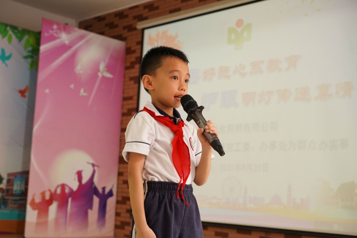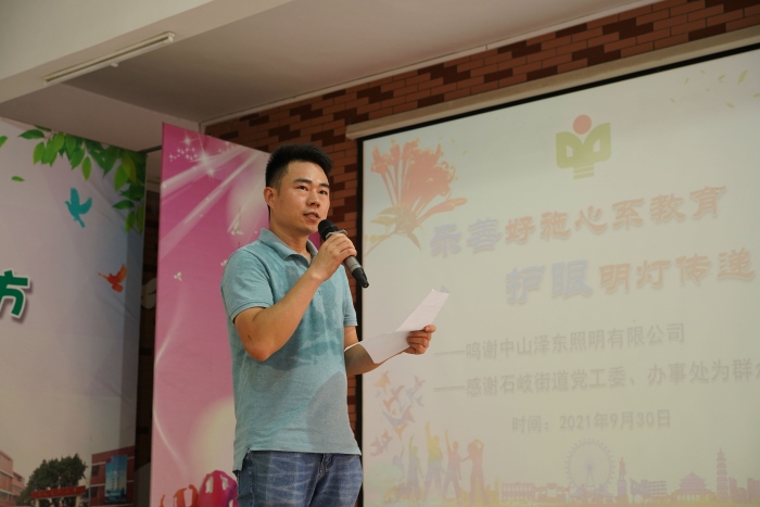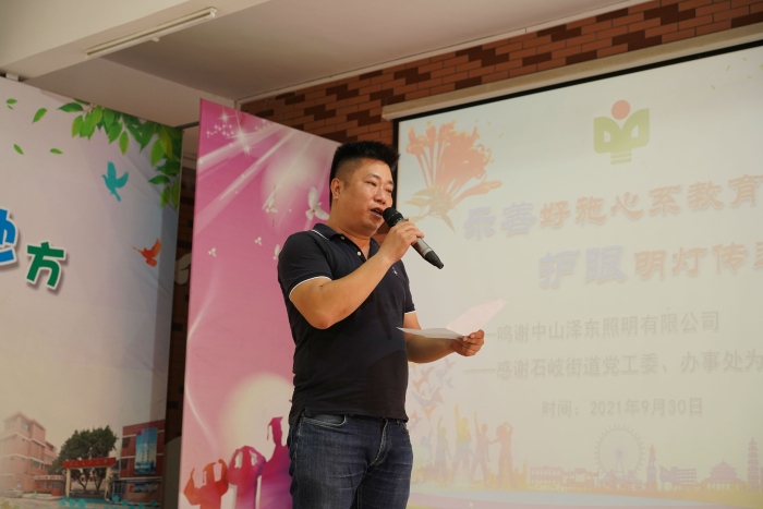 接著愛心企業代表——中山澤東照明有限公司項目副總經理金起發叔叔進行了發言。金叔叔從青少年近視的現狀、近視與學校家居環境的關系等方面呼吁青少年要高度重視視力健康。希望同學們保護雙眼,用心學習,努力成為祖國的優秀人才。