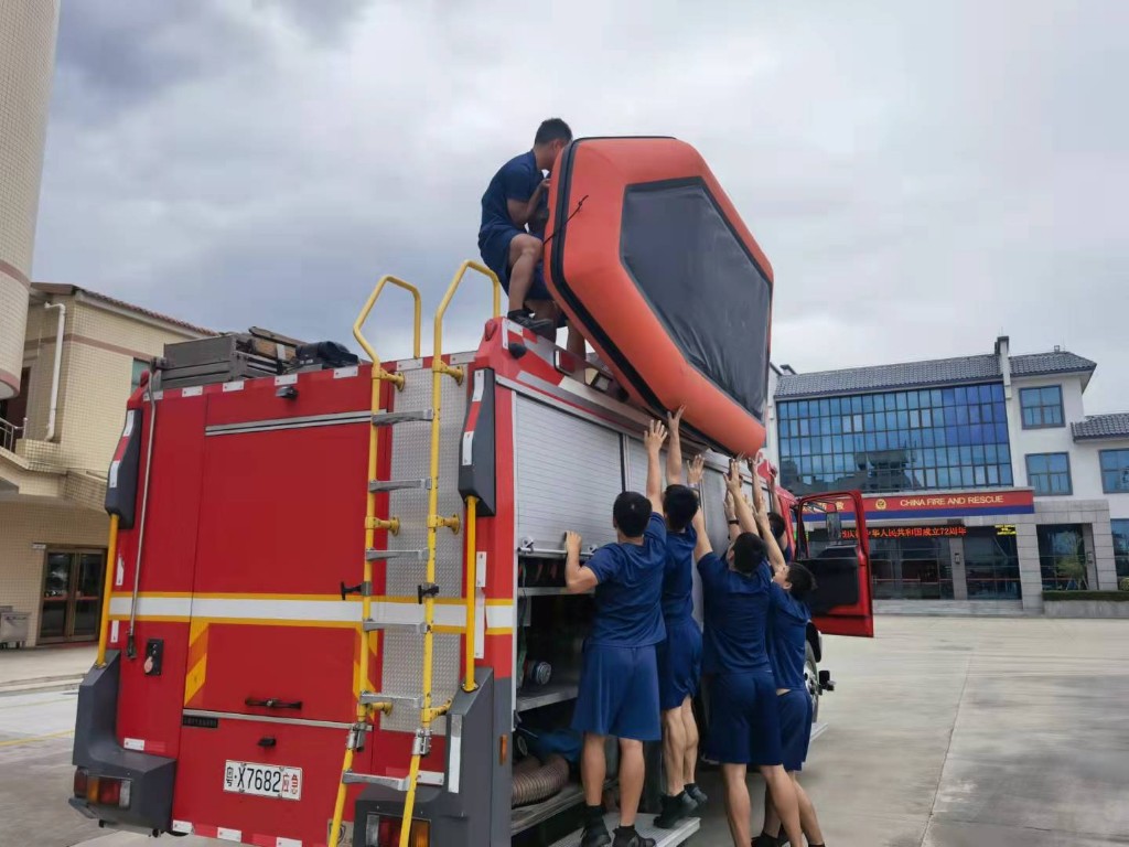 在執勤器材方面,集結救援處置車輛10輛,其中消防車7輛,通信保障、后勤保障、搶險救援指揮車各1輛;水域救援裝備集結150多件,橡皮艇3艘(緊急借調特勤2艘)、沖鋒舟2艘、救生衣45件、救生圈10個、水域救援服20套、救援繩500米。針對此次臺風可能帶來內澇、颶風等次生災害,準備了手抬機動泵3臺,機動鏈鋸5臺、金屬切割機4臺、機動破拆工具組2套。同時,吸取臺風“獅子山”的處置經驗,在全鎮安排三支前置力量前置執勤點。三鄉站負責白石、平南、南龍、橋頭、烏石、平東、鴉崗片區;三鄉專職隊(儷寶龍馬)負責大布、泉眼、雍陌、塘敢、橋頭、圩仔片區;新圩執勤點負責新圩、古鶴、前隴片區。