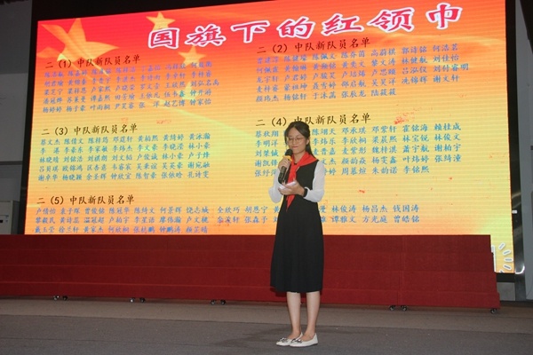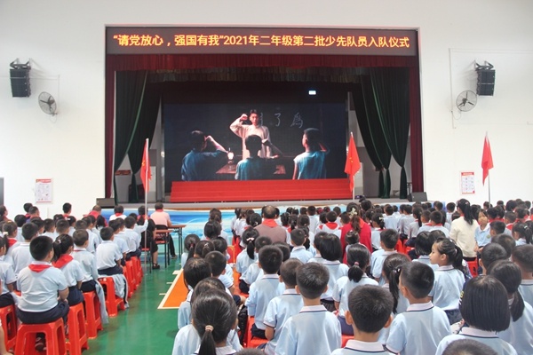 隨著莊嚴(yán)有序的出旗曲,朝氣蓬勃的旗手伴樂出旗,入隊(duì)儀式正式開始。“不怕困難,不怕敵人,頑強(qiáng)學(xué)習(xí),堅(jiān)決斗爭……”全體少先隊(duì)員在李曉雯同學(xué)的指揮下唱響中國少年先鋒隊(duì)隊(duì)歌。隨后,全體同學(xué)一起回顧少先隊(duì)歷史,觀看影片——《致敬紅領(lǐng)巾》。最令人期待的新隊(duì)員入隊(duì)儀式開始了!大隊(duì)副輔導(dǎo)員司徒詠老師宣讀了新隊(duì)員名單。173名孩子被正式批準(zhǔn)加入少先隊(duì)組織,成為一名光榮的少先隊(duì)員。