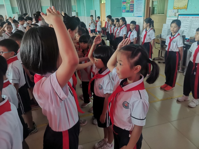 在主題隊日中,各中隊以主題隊課的形式舉行“請黨放心,強國有我——喜迎少先隊中山市第八次代表大會”少先隊微儀式中隊活動。各中隊集中學習共和國成立72周年發展偉大光輝的發展歷程,組織全體少先隊員面向黨旗、團旗、隊旗重溫“四個一”活動:敬一個隊禮、唱一次隊歌,激昂的隊歌,響徹校園,唱響了隊員對少先隊組織的熱愛、對偉大祖國的熱愛!重溫一次誓詞、莊嚴呼號一次,讓每一個隊員人都熱血沸騰,激發了少先隊員的愛國意識!