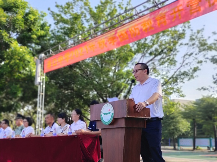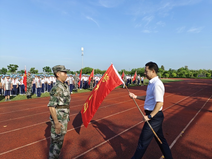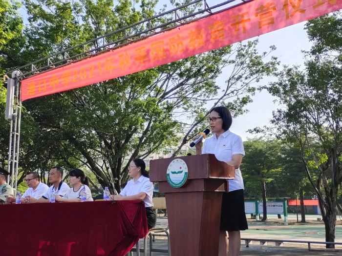 為了強化學生的國防意識,進一步培養學生的愛國情操,增強班集體的凝聚力和向心力,提升學生健康的身心素養,2021年10月11日,中山市港口中學初一新生舉辦了國防教育開營儀式。教育和體育事務中心劉憲軍主任、鎮武裝部副部長賀洪彪先生、學校廖志堅校長攜同全體行政、初一各班班主任出席了本次活動。
