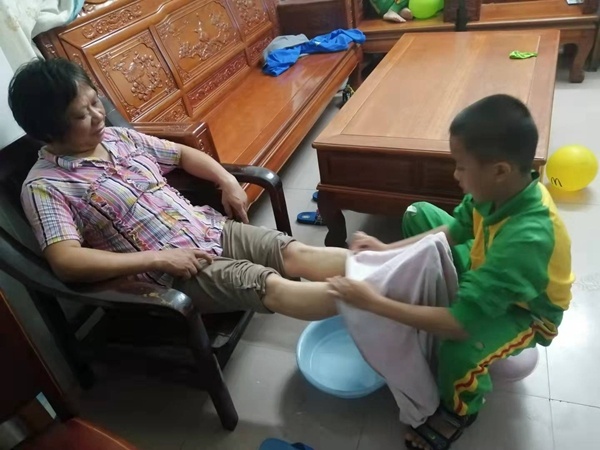 一到三年級的學生在家中對父母長輩說說藏在心中的溫暖話語,為長輩做一些力所能及的家務。四到六年級的學生了解家中長輩的興趣愛好與心愿期望,并且親手為父母長輩做一道他們喜歡的菜。一道道精致的菜肴,一片片感恩敬老之意。雖然有的同學廚藝略顯稚拙,但是其中包含著對家人濃濃的親情愛意。