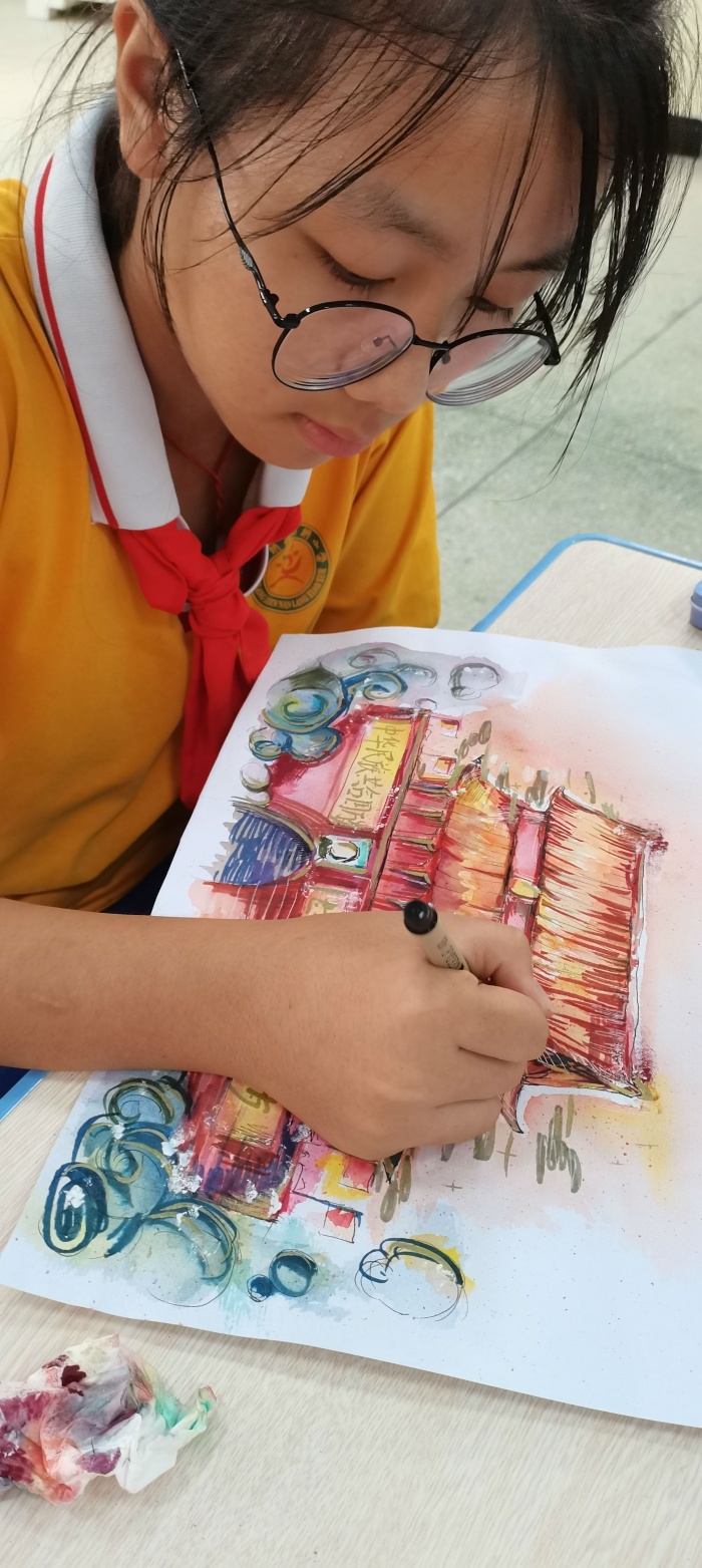 本次以“喜迎國慶,祝福祖國”為主題的愛國主義繪畫活動在南朗小學大禮堂進行現場書畫創作。比賽現場,同學們作畫方式多樣:有的同學先用鉛筆構圖;有的同學直接用勾線筆造型;還有的同學用的是水彩的表現手法。同學們通過各種線條、色彩,仔細地描繪和表達他們看到的、感受到的、想到的心中最美的祖國,畫中充滿對祖國的大好河山的喜愛之情,流露出對祖國母親深深的熱愛。而在書法比賽現場中,同學們書寫的是習近平總書記的重要講話內容,字字都表達了同學們對中華人民共和國深深的愛意。