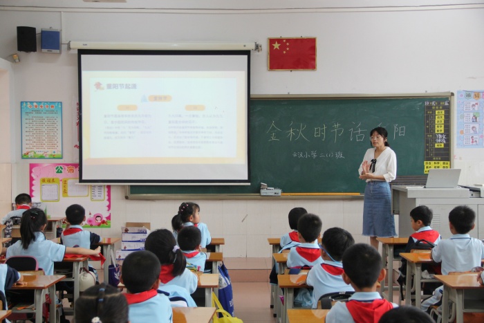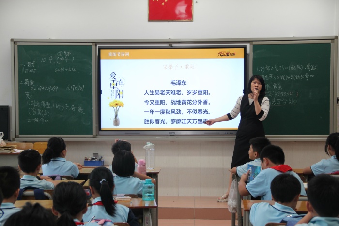 在主題班會上,老師向學生們簡單地介紹了重陽節的起源、民間習俗活動、神話故事傳說以及有關重陽節的詩詞,不僅讓學生了解到有關重陽節的知識,還讓學生懂得了“孝親敬老”的中華傳統美德,要做到常懷敬老之心,繼承敬老、愛老的傳統美德。
