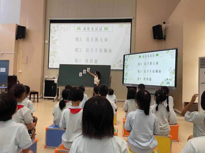 活動伊始,由陳靖甜老師帶來二年級上冊第2課《乃喲乃》。陳老師重點教授do mi sol的音準。她通過節奏練習、身勢活動讓學生熟悉do mi sol的音高音準,隨后用“師問生答”的方式引導學生運用do mi sol進行旋律創編,鞏固了學生對do mi soli三個音的掌握,各個環節環環相扣,層層深入,為大家帶來了一節身勢與創編相結合的精彩課堂。