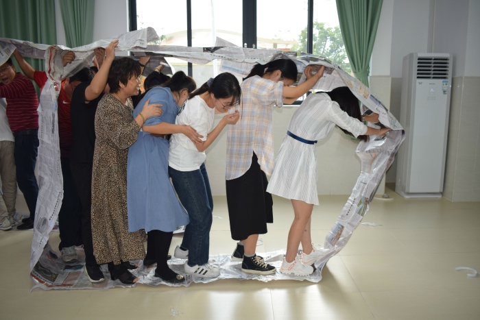 本次活動內容豐富,形式多樣,趣味十足。王雅老師先是營造了在荒島求生大背景,然后帶領教師們進行三輪體驗式活動:第一輪是建立互助逃生小組,教師們自由組建7人小組,選出隊長,大伙一起商量編隊名、唱隊歌,接著進行2分鐘團隊士氣展示;第二輪是尋寶大作戰,尋找逃出荒島的物資:6只襪子、一副眼鏡、兩個水壺、兩對鞋、一個包,比一比哪一組用時最短;第三輪是無敵風火輪,每小組利用報紙和膠帶制作一個可以容納全體團隊成員的封閉式大圓環,將圓環立起來全隊成員站到圓環上邊上行走,滾動大圓環最快的為最終贏家。三輪活動總分前三名的小組勝出。每一輪活動結束后,王雅老師都會組織教師們進行5分鐘的反思分享,思考在這個環節中小組成員或自己為什么這么快或這么慢完成任務?贏了或輸了的原因是什么?下一次個人或團隊如何才能做到最好?教師們在分享環節能積極發言,結合自己的切身體會分享了自己的所見所聞、所思所想,得到了老師們的一致好評。