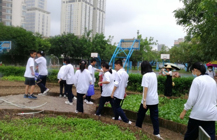 坦洲實驗中學的古娜芬老師帶來了一節精彩的《菜苗的移栽》公開課。她先帶領學生們上了10分鐘的理論課,了解菜苗移栽的操作方法和注意事項,然后讓學生們以9人為一組自由組隊,領取勞動工具,進行勞動分工。學生們興高采烈地帶著工具到學校的勞動教育基地進行種菜勞動。他們有的起苗,有的挖窩,有的種菜,有的澆水,干的不亦樂乎。