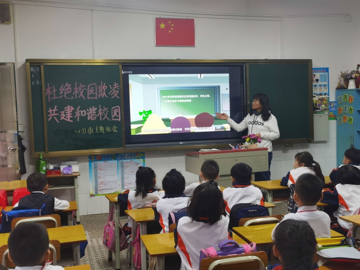 視頻講話中告訴學生校園欺凌是指同學間欺負弱小、言語羞辱及敲詐勒索甚至毆打的行為,主要表現形式有:索要錢物,不給就威逼利誘;以大欺小,以眾欺寡;為了一點小事就大打出手,傷害他人身體,侮辱他人性格;同學們因“義氣”之爭,用暴力手段爭短論強等。通過視頻學習讓學生了解什么是校園欺凌行為 ,并讓他們從小學會保護自己。觀看視頻后,各班針對本班的實際情況進行強化教育。
