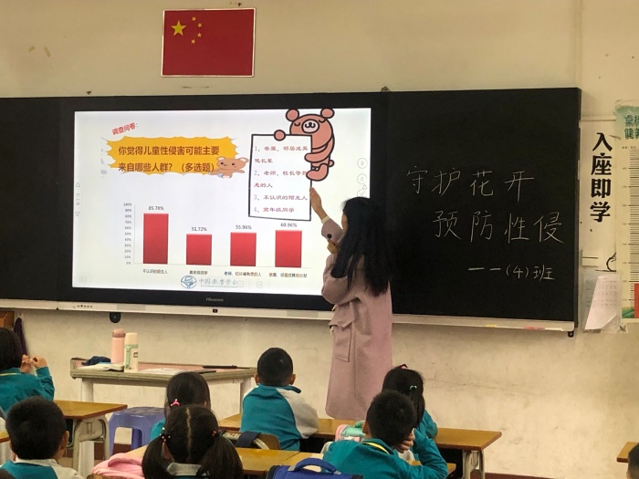 班會課上,老師借助多媒體輔助解說,與學生充分互動交流,從“教孩子們認識隱私部位”“教孩子們識別實施性侵害的伎倆”等,給學生上了一堂保護未成年人的性教育課程,讓學生建立了“隱私”的概念,學會如何保護自己和尊重別人的隱私部位等知識。接著,課堂引入小游戲“身體紅綠燈”教孩子們如何辨別壞人、保護自己,當面臨正在實施的性侵害如何處理、遭遇性侵害后如何尋求幫助等問題展開學習,讓孩子們提高警惕,增強防范意識。
