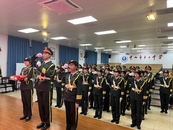 時值冬日,寒風凜凜,但愛國熱情沒有降溫。在2021年12月20日周一升旗儀式上,中山市第二中學在學校階梯室舉行了第十五屆國旗班和第十六屆國旗班交接儀式,第十五屆國旗班成員高三20班的沈佩祺和高三11班的徐自宣同學主持交接儀式。