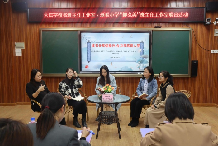 聚是一團火,散是滿天星。為貫徹落實教育部下發的《關于進一步加強中小學班主任工作的意見》《中共中央辦公廳、國務院辦公廳關于進一步減輕義務教育階段學生作業負擔和校外培訓負擔的意見》(中辦發﹝2021﹞40號)以及《中小學德育工作指南》精神,提升班主任工作室成員隊伍專業化發展,促進班主任隊伍建設,2021年12月7日下午,大信學校班名主任工作室為創建巾幗文明崗,由工作室“擷香坊“和板芙鎮新聯小學“娜么美”班主任工作室聯合舉辦班主任讀書分享及主題沙龍活動。活動由大信學校德育處副主任高靜帶隊,名班主任工作室主持人林京京,擷香坊坊主高姍姍以及成員出席。