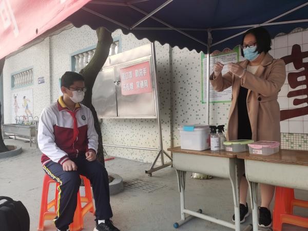 學(xué)校大門(mén)是校園疫情防控的第一道防線,把好校園第一道關(guān)卡至關(guān)重要。演練從模擬學(xué)生排隊(duì)等候進(jìn)入校園開(kāi)始,學(xué)生分兩個(gè)通道進(jìn)入校門(mén),經(jīng)用體溫測(cè)量?jī)x檢測(cè)學(xué)生體溫后,體溫正常者有序進(jìn)入校園。當(dāng)發(fā)現(xiàn)學(xué)生體溫異常時(shí),迅速用水銀溫度計(jì)進(jìn)行復(fù)測(cè),如果體溫依舊異常,送至隔離室,上報(bào)行政并進(jìn)行信息登記并聯(lián)系衛(wèi)生部門(mén)作進(jìn)一步處理。