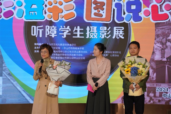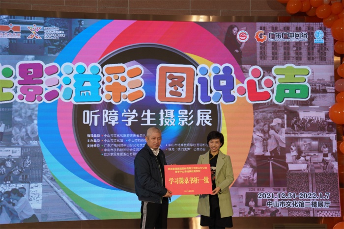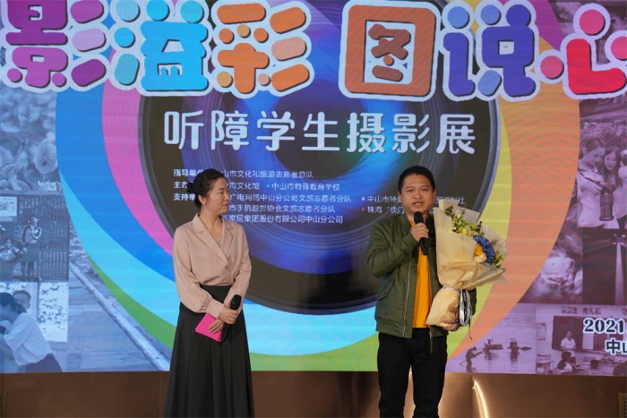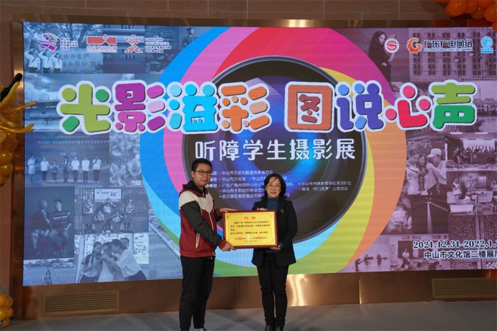 頒牌儀式上,中山市文化館為支持單位廣東廣電網絡中山市分公司授予感謝匾牌,歐派家居集團股份有限公司中山分公司為市特校捐贈課桌椅一批。隨后,引領聽障孩子入門的珠海“快門無聲”公益項目創始人朱習女士對孩子們的成長表示驚喜和欣慰,“光影溢彩 圖說心聲”聽障學生攝影培訓項目負責人、本次攝影展主要策展人之一賀億強先生表達了自己的感謝與激動,并對聽障孩子今后攝影學習作了詳細規劃。活動中,嘉賓與學生代表共同為本次開幕式剪彩,接著嘉賓們一同步入展區,靜心賞鑒聽障孩子們用眼睛“聽到”的世界,用鏡頭記錄的生活,為明媚綻放的生命之光點贊!