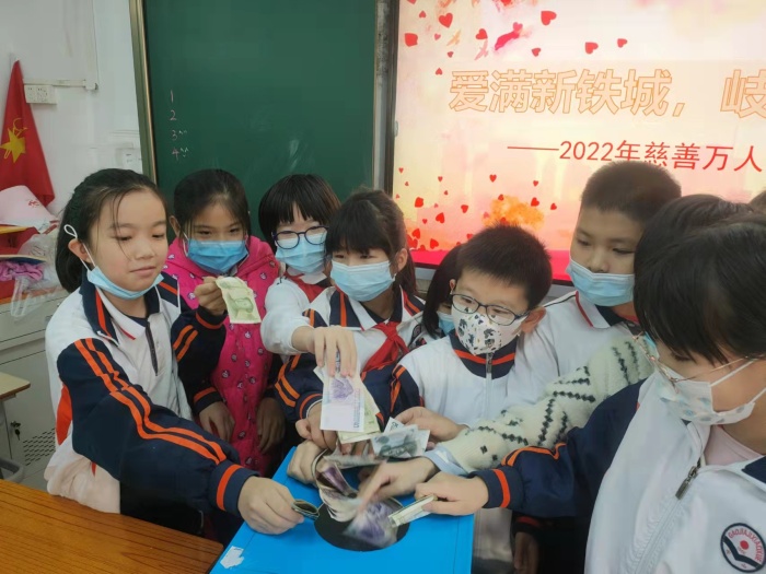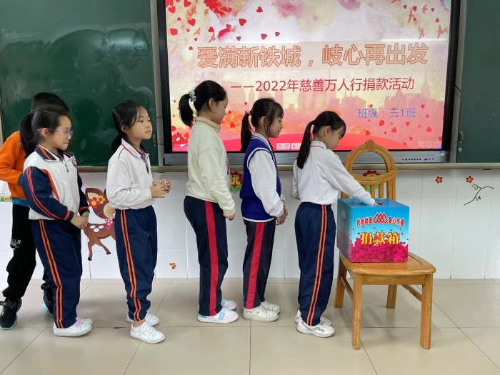 此次慈善萬人行活動(dòng)主題為“愛滿新鐵城,岐心再出發(fā)”。在鄭結(jié)霞校長的引領(lǐng)下,學(xué)校的行政班子與老師們也齊心協(xié)力為慈善事業(yè)獻(xiàn)出一己之力。這一小小舉動(dòng),為學(xué)校的慈善萬人行捐款活動(dòng)開了好頭。雖然秉承著自愿捐款,以力所能及之力奉獻(xiàn)愛的原則向孩子們發(fā)出倡議,但正如本次活動(dòng)主題那般,整個(gè)愛心捐款活動(dòng)收獲了孩子們滿滿的愛心。此次活動(dòng)以班級(jí)為單位進(jìn)行,利用大課間時(shí)間,由班主任主持此次的活動(dòng)?;顒?dòng)進(jìn)行期間,看著孩子們將提前準(zhǔn)備好的零錢迫不及待地平鋪在課桌上,滿臉笑顏地等待著自己走上捐款箱的那一刻。有的經(jīng)過深思熟慮掏出自己珍藏多時(shí)的壓歲錢獻(xiàn)上愛心;有的則是和父母商量著從買零食、玩具的零花錢中拿出一部分出一臂之力;而有的孩子更是和父母一起為愛助航??粗且粡垙埍凰麄冏У糜悬c(diǎn)皺巴巴的零錢,再看看他們臉上那幸福與滿足的笑臉,由衷為每個(gè)孩子心中的那份天真且簡單的愛心而感動(dòng)。