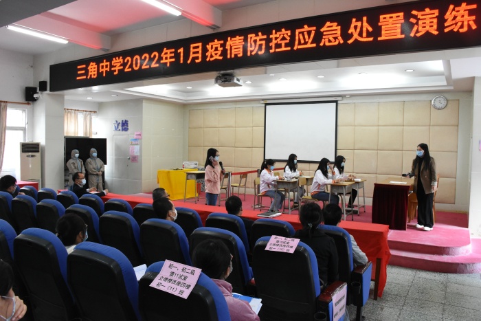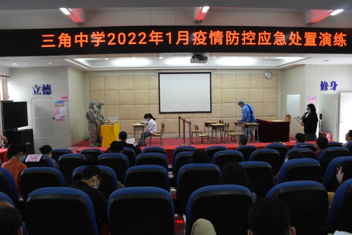 為扎實做好校園疫情防控工作,確保期末考試各項工作的順利開展,1月7日下午,三角中學舉行2022年疫情防控應急處置演練。學校行政領導、學校總務處、醫務處相關人員及全體教師代表參加了演練,三角醫院劉森副院長蒞臨現場作專業指導。