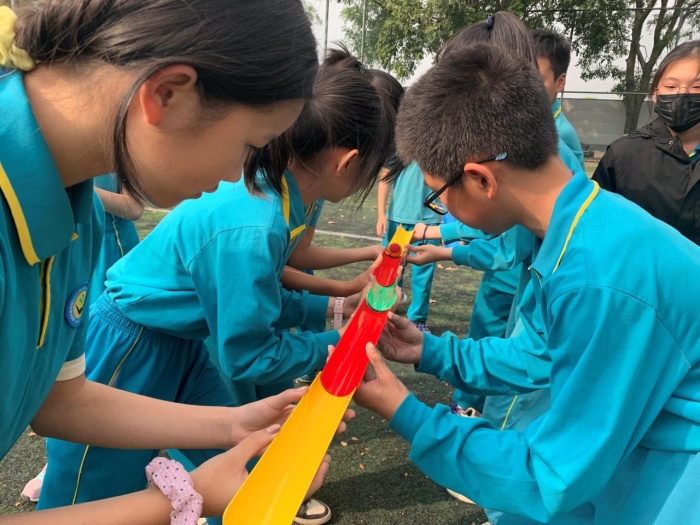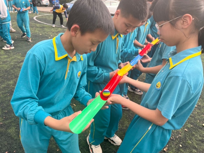 活動中,通過抽簽的形式把同學(xué)們分成4個小組,每組自行選出隊長、確定隊名和口號,隨后的“珠行萬里”環(huán)節(jié),要求同學(xué)們分組站成一排,通過共同傳遞一個圓球,讓學(xué)員感受團隊間的配合、銜接以及自我控制能力,是培養(yǎng)團隊協(xié)作能力的游戲,這項游戲考驗的是孩子們彼此接納、協(xié)同合作的能力,在愉悅的氛圍中孩子們悄悄感受溝通的重要性。