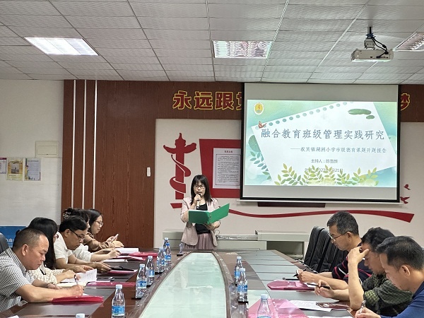 本次活動由湖洲小學德育副主任范丹丹老師主持。活動首先由課題主持人陳雪顏主任作開題報告。陳主任從課題的研究背景和理論依據、研究框架、研究思路、創新之處以及預計成果五個方面展開匯報,擬探討出小學融合教育的一些新思路、新方法,形成一套行之有效、具有普遍性意義的能力提升模式,以此推動融合教育更好地發展。
