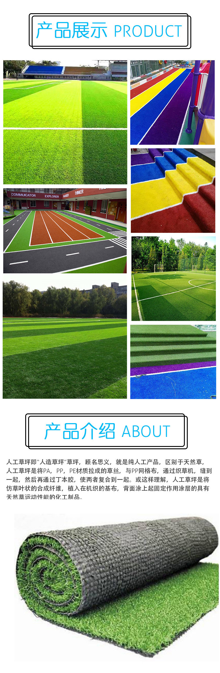 人工草坪即“人造草坪”草坪,顧名思義,就是純人工產品,區別于天然草,人工草坪是將PA,PP,PE材質拉成的草絲,與PP網格布,通過織草機,縫到一起,然后再通過丁本膠,使兩者復合到一起。或這樣理解,人工草坪是將仿草葉狀的合成纖維,植入在機織的基布,背面涂上起固定作用涂層的具有天然草運動性能的化工制品。