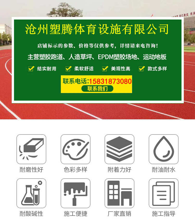 ??我公司擁有先進(jìn)的工藝技術(shù)和機(jī)械加工設(shè)備。專業(yè)生產(chǎn)各種規(guī)格的人工草坪、EPDM彩色橡膠顆粒、膠水等。廣泛應(yīng)用于塑膠跑道、籃球場、足球場、網(wǎng)球場、游泳池、體育場館運(yùn)動(dòng)地面、幼兒園防滑地面等。該產(chǎn)品具有綠色環(huán)保、色澤穩(wěn)定且抗紫外線、耐磨損、彈性好,使用壽命長,易鋪設(shè)保養(yǎng)等優(yōu)點(diǎn)。產(chǎn)品經(jīng)上海和深圳檢測中心檢測,各項(xiàng)技術(shù)指標(biāo)全部合格,達(dá)到行業(yè)標(biāo)準(zhǔn)。 我們本著以質(zhì)量求生存,以周到的服務(wù)求發(fā)展,熱忱歡迎海內(nèi)外廣大客戶和我們合作,攜手共創(chuàng)輝煌!