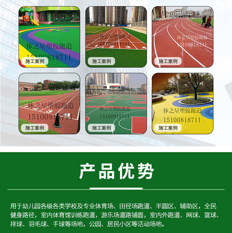 主營透氣型跑道材料、混合型跑道材料、三元乙丙橡膠顆粒材料、硅PU球場材料、PU塑膠材料、預制型卷材、人造草坪TPE顆粒等