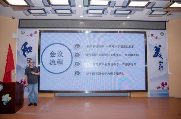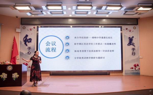 本次英語學科大教研工作會議由順德區教育發展中心教研室小學英語教研員田湘軍老師主持。會議開始首先由廣東省英語特級教師、順峰中學潘惠紅校長講話。她代表順峰中學歡迎順德區英語教研骨干們。她希望各位英語科骨干在順德區教育高質量發展的征途上上,積極行動起來,讓英語學科的教育教學質量更上一個臺階。