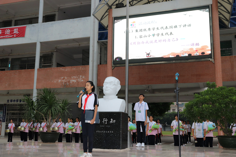 莊嚴的升旗儀式完畢后,育美教育集團容山小學的譚懿同學、育美教育集團振華小學的歐雅菲同學分別作了題為《用勤奮成就更好的自己》和《爭做最美學生,遇到最美的自己》的演講。育美教育集團文華中學夏仁斌主任作《為美好人生奠基》主題講話。