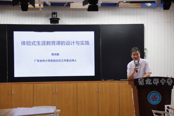 兩節(jié)研討課結(jié)束后,由廣東省第三批名班主任工作室主持人、廣東省思想政治優(yōu)質(zhì)課大賽現(xiàn)場授課特等獎(jiǎng)獲得者黃光毅老師做課例點(diǎn)評以及進(jìn)行《體驗(yàn)式生涯課堂的構(gòu)建》專題講座。在講座過程中,黃老師從生涯公開課現(xiàn)狀掃描、生涯活動(dòng)體驗(yàn)的五大原則等方面對體驗(yàn)式生涯規(guī)劃課堂的構(gòu)建做了深入淺出的講座。