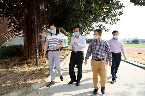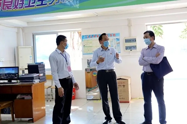 2月27日下午,佛山市教育局疫情防控工作組嚴文金、曾昭皓、何愛華一行到江義中學檢查指導疫情防控工作,勒流街道教育局朱湘紅、甘永杰、梁小利等陪同,江義中學疫情防控工作領導小組組長、黨總支書記、校長胡和秋匯報了學校防控工作。