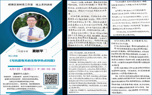 師生組織線上教學(xué)與學(xué)習(xí)是對抗疫情的有力手段,“病毒與疫情”是一個很好的教育契機(jī),為此順德區(qū)謝樹亮特級教師工作室組織開展了“線上系列講座”,特邀夏獻(xiàn)平老師做了《與抗疫有關(guān)的生物學(xué)熱點(diǎn)問題》專題講座,夏老師是特級教師、正高級教師、省名師工作室主持人,享受深圳市政府特殊津貼,夏老師豐富的專業(yè)知識,結(jié)合當(dāng)前的疫情熱點(diǎn),圖文并茂地給四百余位師生講解了“新冠病毒”中的生物學(xué)知識,線上收聽講座的工作室成員和學(xué)生感受很深,師生們用文字記錄了自己聽講座的感受。