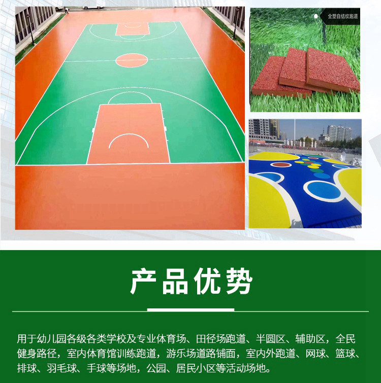 滄州塑騰體育設施有限公司――專業從事地面運動場地鋪裝,硅PU場地鋪設為基礎的專業團隊。??我公司擁有先進的工藝技術和機械加工設備。專業生產各種規格的人工草坪、EPDM彩色橡膠顆粒、膠水等。廣泛應用于塑膠跑道、籃球場、足球場、網球場、游泳池、體育場館運動地面、幼兒園防滑地面等。該產品具有綠色環保、色澤穩定且抗紫外線、耐磨損、彈性好,使用壽命長,易鋪設保養等優點。產品經上海和深圳檢測中心檢測,各項技術指標全部合格,達到行業標準。 我們本著以質量求生存,以周到的服務求發展,熱忱歡迎海內外廣大客戶和我們合作,攜手共創輝煌!