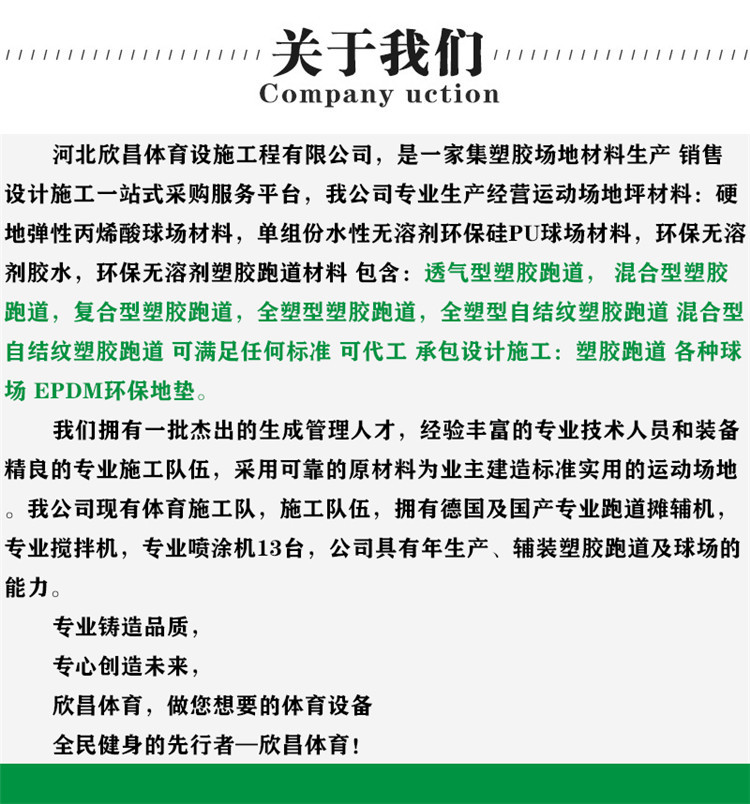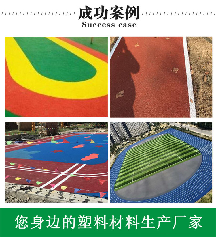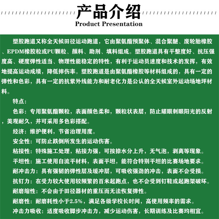 塑膠跑道又稱全天候田徑運動跑道,它由聚氨酯預聚體、混合聚醚、廢輪胎橡膠、EPDM橡膠粒或PU顆粒、顏料、助劑、填料組成。塑膠跑道具有平整度好、抗壓強度高、硬度彈性適當、物理性能的特性,有利于運動員速度和技術的發揮,有效地運動成績,摔傷率。塑膠跑道是由聚氨酯橡膠等材料組成的,具有一定的彈性和色彩,具有一定的抗紫外線能力和耐老化力是公認的全天候室外運動場地坪材料。