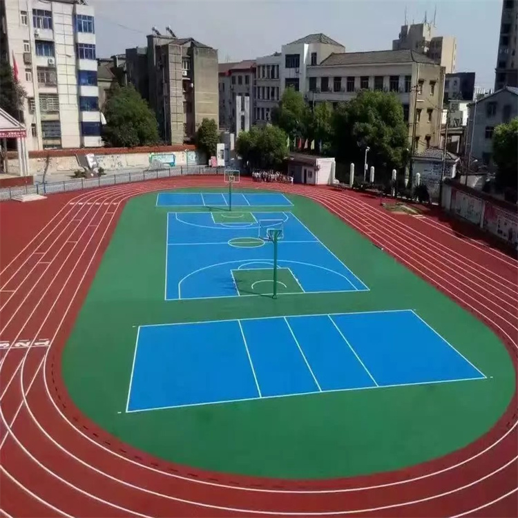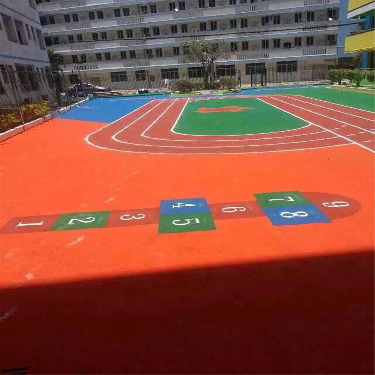 3、機械噴涂面層1.5mm厚,單組份膠粘劑+EPDM顆粒,再反方向噴涂一遍。
