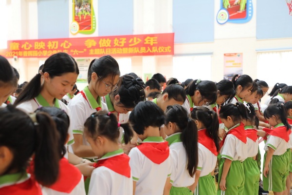 8點40分,學校籃球館內熱鬧非凡,簡單而隆重的 “紅領巾心向黨 爭做新時代好少年”暨一年級新隊員入隊儀式在這里舉行。儀式由六(2)中隊的幸子越同學主持。活動伊始,伴隨《出旗曲》,旗手們精神抖擻,邁著正步、高擎隊旗步入會場,出旗儀式拉開了活動的序幕。隨后,大隊長王敏喬宣讀一年級被批準加入中國少年先鋒隊隊員名單,祝賀他們成為光榮的少先隊員。隨著《紅旗飄起來》音樂響起,六年級隊員為一年級新隊員佩戴紅領巾,隨即新老少先隊員互敬隊禮。接著,少先隊大隊輔導員杜沁源老師為各中隊授旗,隊員代表為各中隊輔導員戴上鮮艷的紅領巾,全體隊員共同高唱《中國少年先鋒隊隊歌》,嘹亮的歌聲展示了隊員們堅毅的信心和無比自豪的情感。最后,杜沁源老師帶領隊員呼號。