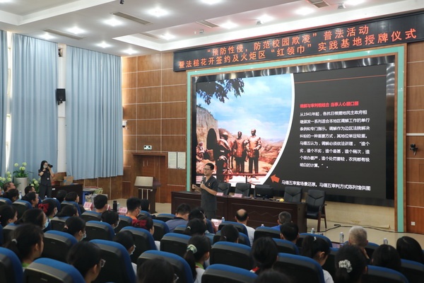 活動首先進行“法槌花開”簽約及火炬區“紅領巾”實踐基地授牌儀式,在全體與會人員的共同見證下,中山市第一法院審判管理辦公室負責人丁向娜與火炬開發區德育專干謝藝波上臺現場簽約,謝藝波代表火炬開發區教育事務指導中心向中山市第一人民法院授予“火炬區紅領巾文明實踐基地”牌匾。丁向娜表示,中山市第一人民法院開展“法槌花開”系列普法活動,旨在以法院現場研學、與法官面對面交流、法律知識問答、模擬法庭、法官體驗等豐富形式,達到以真實體驗潤物無聲的普法效果,歡迎各學校組織學生到法院開展相關活動,進一步提高學生法律和自我防范意識。