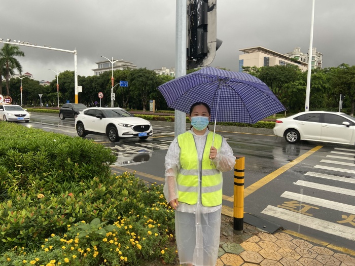 早上7點20分,開發區第一小學的教師志愿者們就來到世紀一路十字路口,教師志愿者穿著統一的志愿者服,佩戴口罩,盡管受臺風“查帕卡”的影響,仍阻止不了教師志愿者的行動,她們冒雨堅守崗位,與交警們一起在各個主要路口,指揮著出行的市民安全有序的過馬路。在勸導過程中,非機動車不按車道行駛、越過停止線、未佩戴頭盔、超載等不文明行為,在志愿者勸導下路口漸漸整齊有序。她們還為行人做指引,保證行人能安全過馬路。