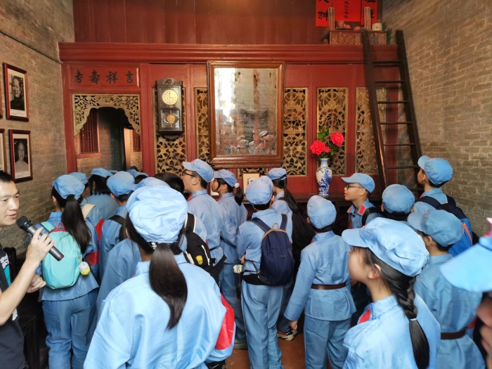 4月25日,天公作美,風和日麗、碧空如洗。中山火炬高技術產業開發區第一小學六年級(4)班在家委的精心組織下,全班51個親子家庭齊聚一堂,出發前往中山沙溪鎮明亭村參觀申明亭革命史跡館和揚子江故居,開展以“踏尋紅色足跡,共慶建黨100周年”為主題的親子研學活動。